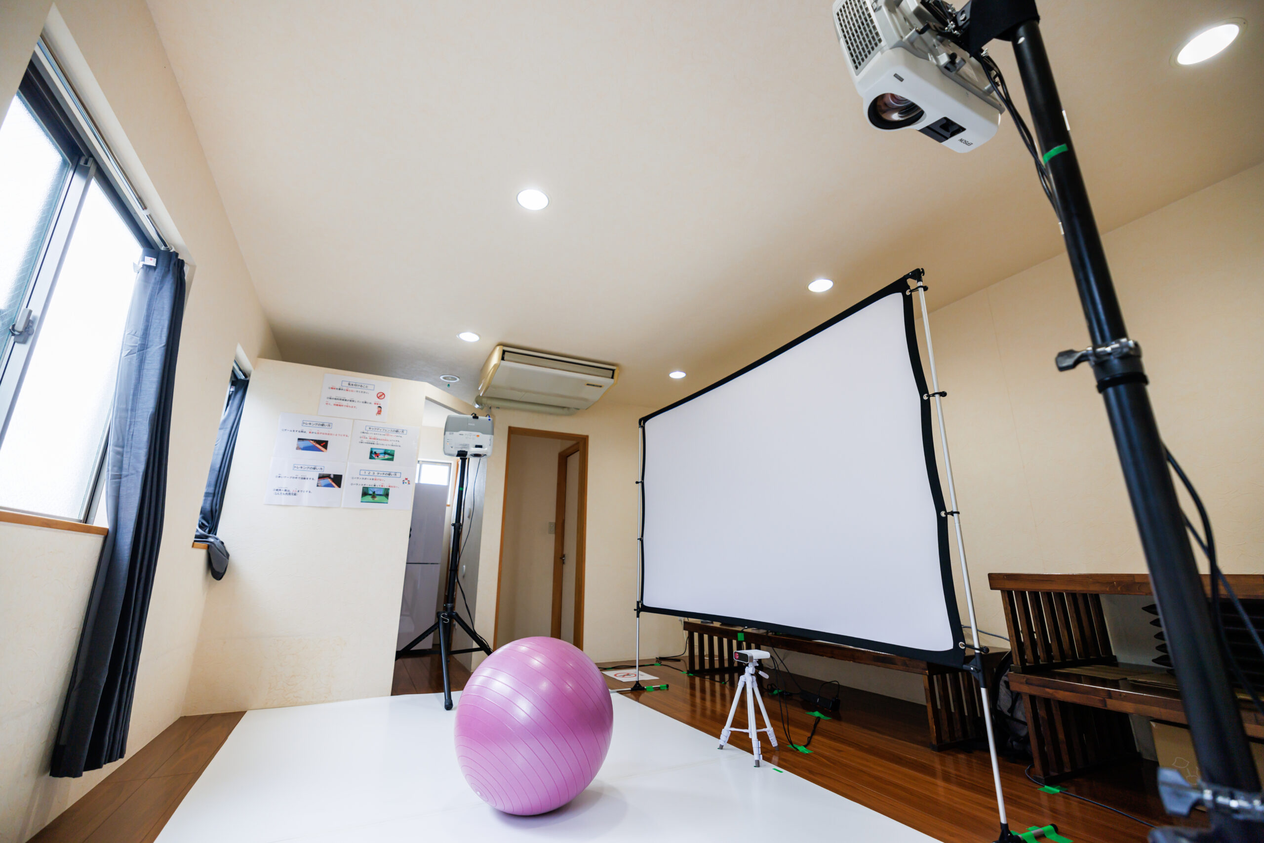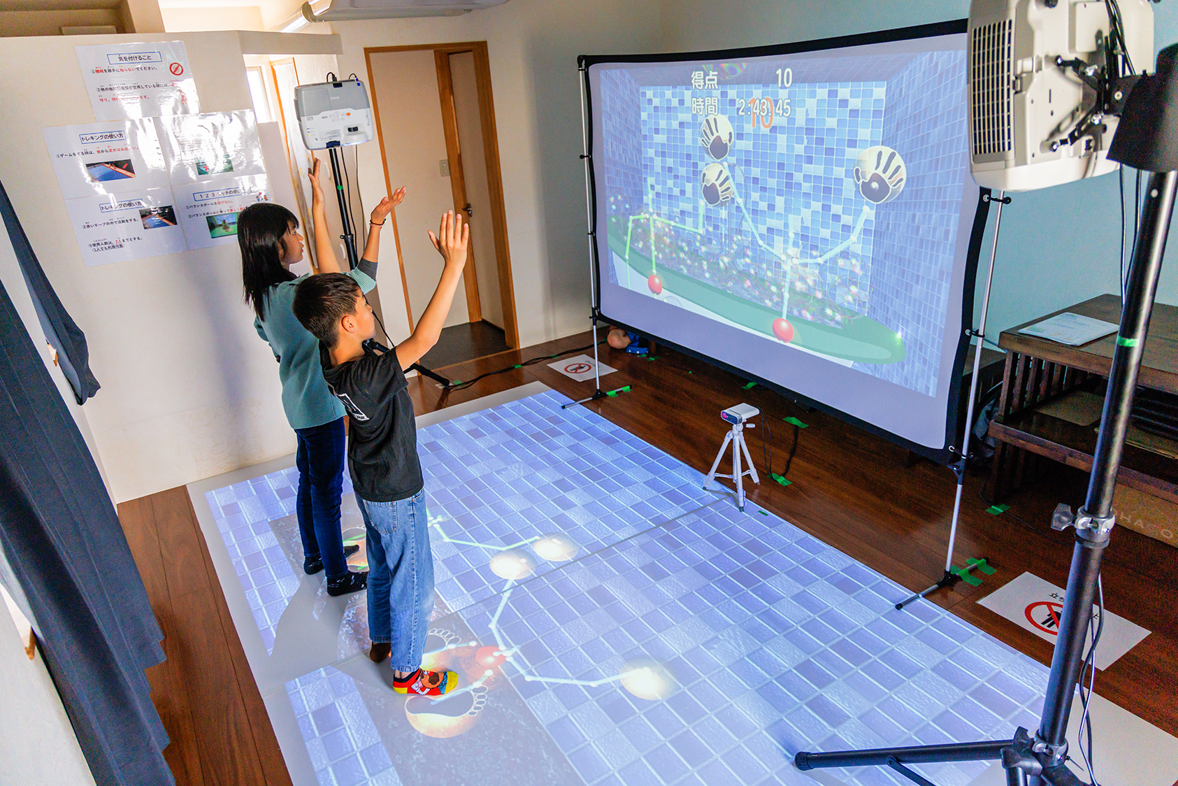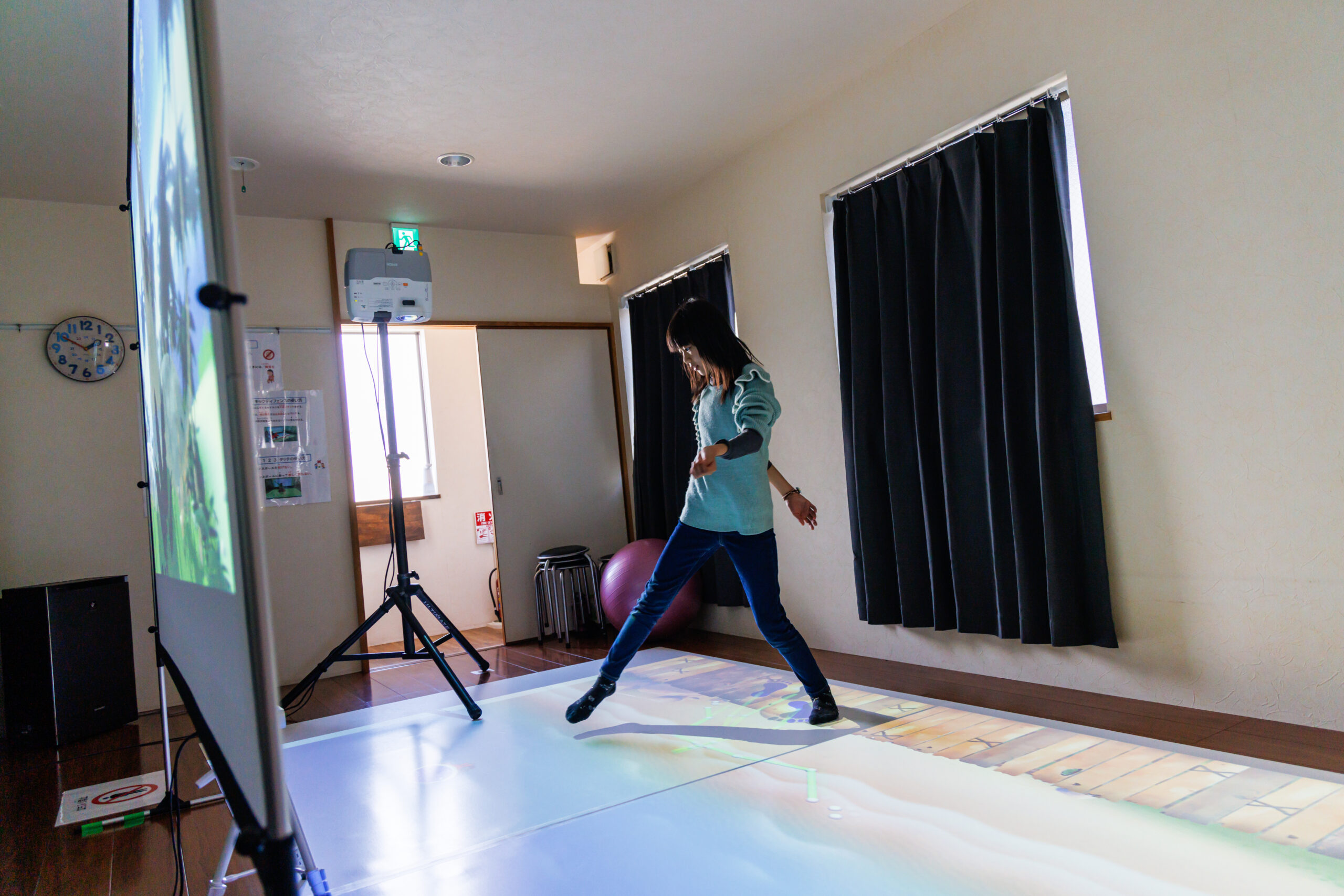 トレキングは、楽しみながら、姿勢の改善・身体の連携運動による認知の向上が見込めます。プロジェクションマッピングを利用したVRゲームを用いて、「姿勢が保てない」「動作と動作がうまくつながらない」という発達性協調運動障害のある利用者様の統合的な運動療法を楽しみながら行えます。運動が苦手な利用者様も楽しく体を動かすことができ、体の使い方や人との関わり方の学習・自己肯定感の向上を目指します。