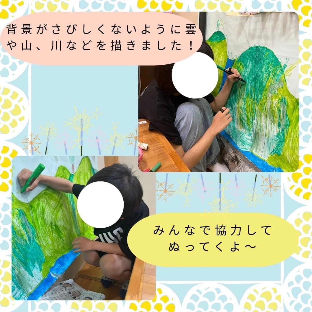 絵が得意な利用者様が山や滝、雲の下書きを書いてくださり、それを他の利用者様が塗るというように皆様で協力して鯉のぼりに彩りをつけてくれています🎨