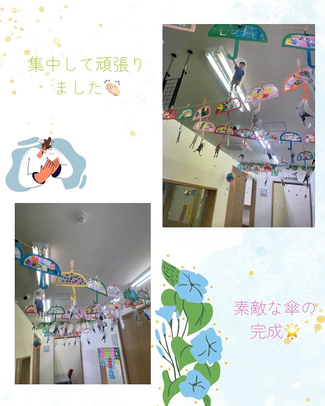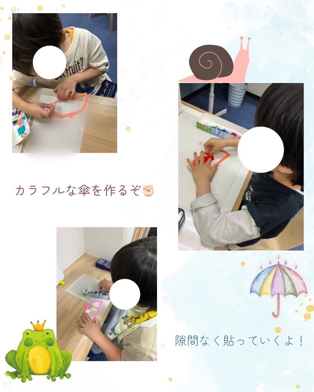 傘の模様を作成する際、色紙やシールを隙間なく埋めていくように貼ったり、均等な間隔を開けて貼ったりして工夫して取り組まれています。児童さんたちが実際に傘をさしているように見せるため、一人ひとり写真を撮影して作成した傘と貼り付けると…